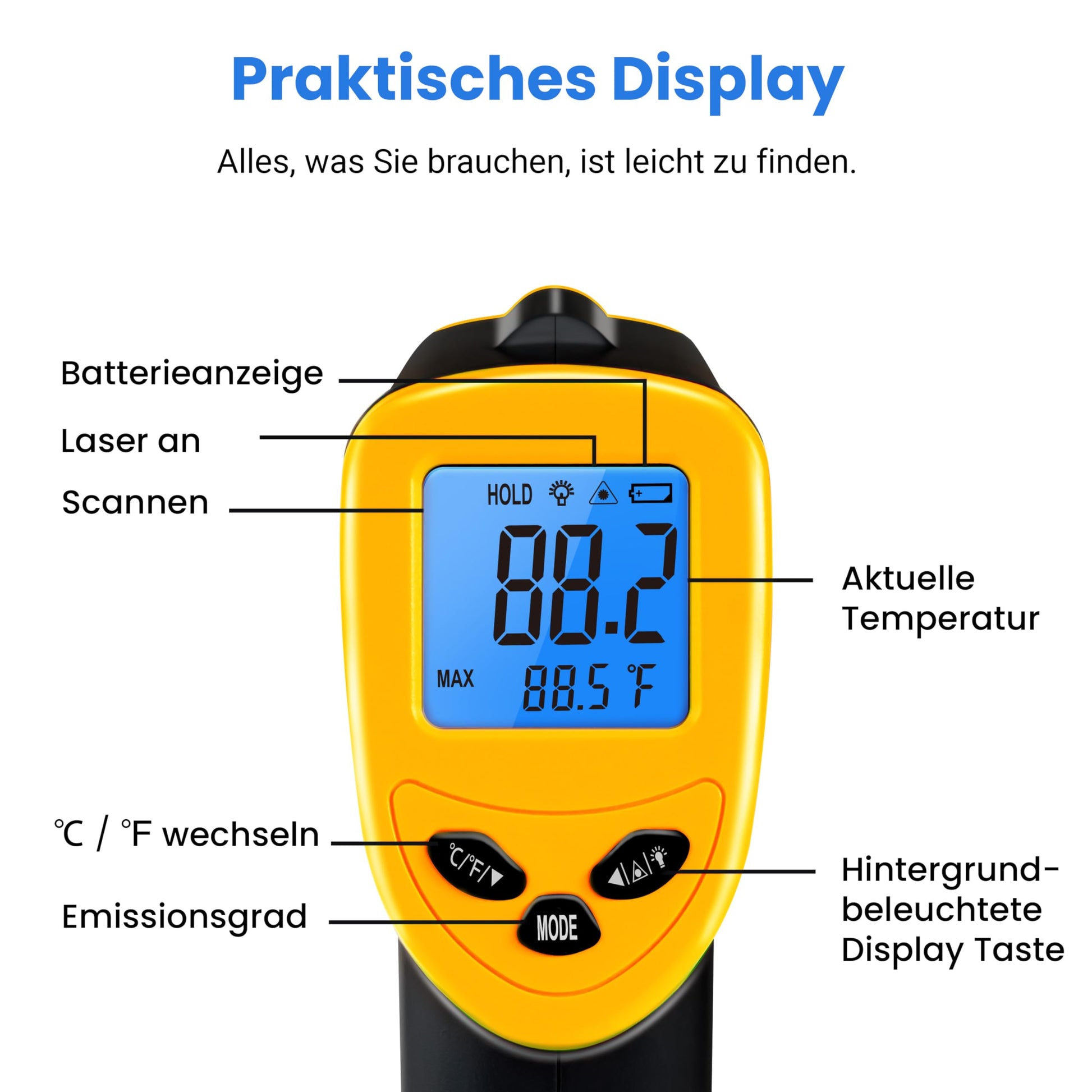- Breiter Temperaturbereich: Messen Sie die Oberflächentemperatur im Bereich von -50°-610°C/-58°-1130°F und erhalten Sie Ihr Ergebnis in 500 ms; Das Display zeigt auch die maximale Temperatur der Oberfläche, die Sie messen